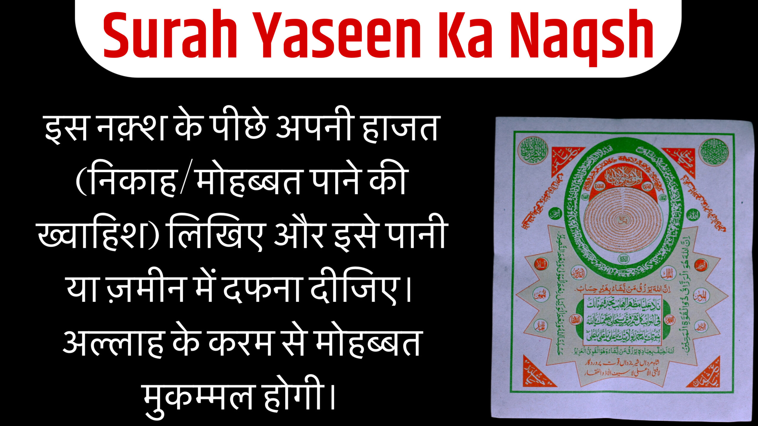 Surah Yaseen Ka Naqsh – इसके पीछे अपनी हाजत (निकाह या मोहब्बत की दुआ) लिखकर रखा जाता है। अल्लाह के करम से दुआ पूरी होती है।